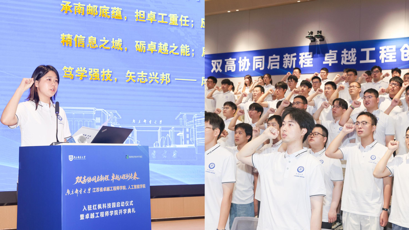 开学典礼上,卓工学院全体新生庄严宣誓:“承南邮底蕴,担卓工重任;应产业之需,融产学研用……成卓越人才,为国家建功!”
