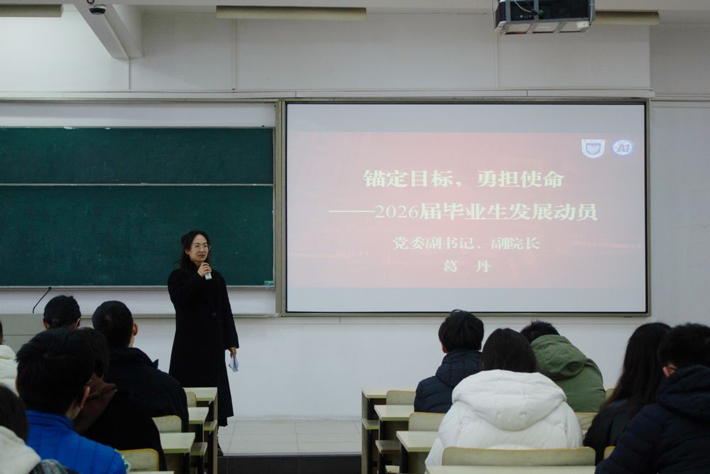 大会以“奋进新征程,启航向未来”为主题,旨在引导毕业生明确发展方向、增强安全意识、做好毕业规划。葛丹以《锚定目标,勇担使命》为题作动员讲话,勉励同学们坚定理想信念,勇于担当时代责任。辅导员韩烁围绕校园安全开展专题教育,切实筑牢学生安全防线。辅导员李亚平结合考研慰问与元旦寄语,回顾年级成长历程,并发布“奋进新程,即刻出发”行动倡议,鼓励同学们科学规划、积极行动。企业嘉宾也应邀进行就业指导分享,从实践角度助力学生提升就业竞争力。